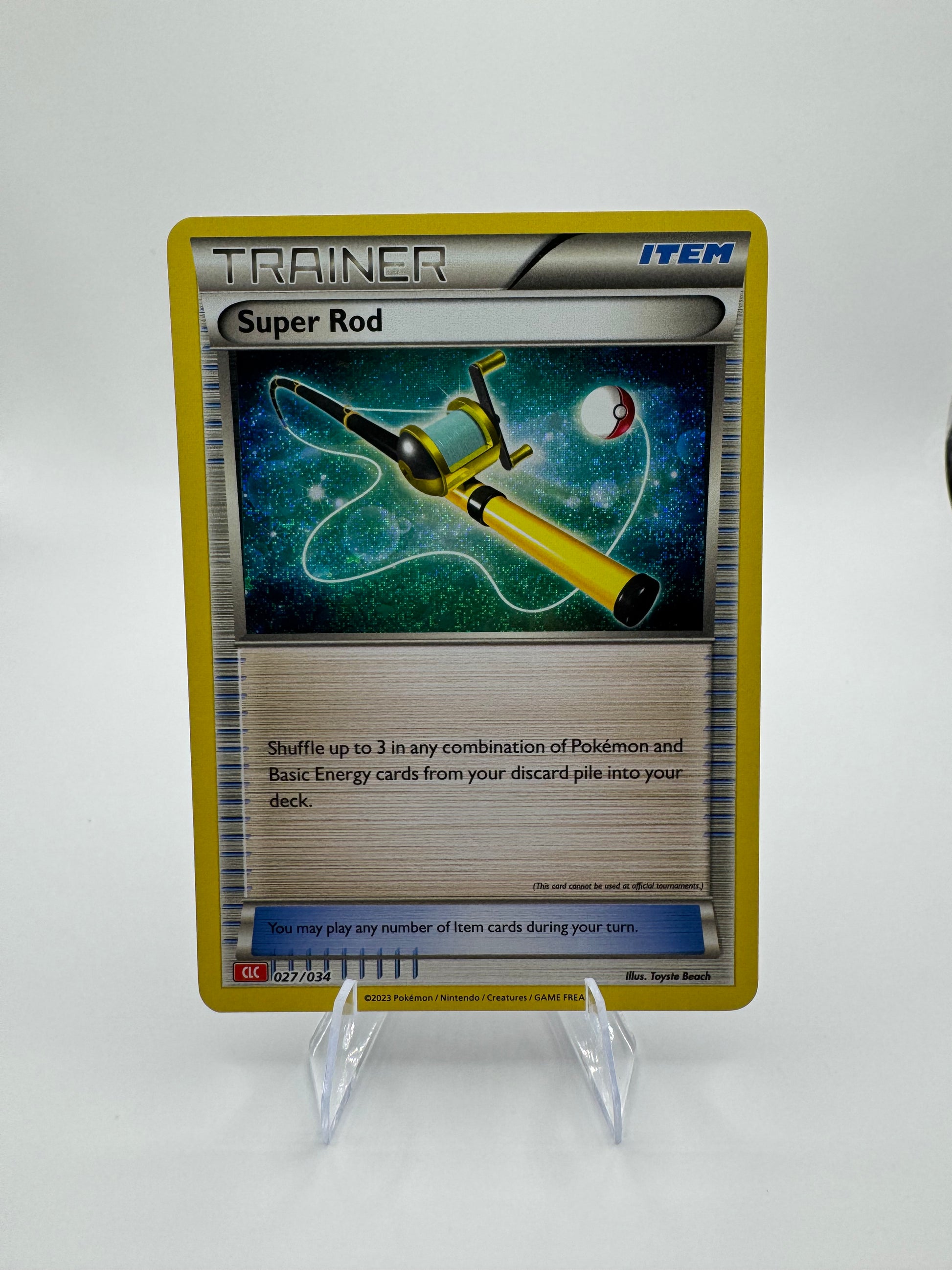 The Super Rod (CLC) 027/034 trading card game classic holo is a sought-after collectible card from the Pokémon TCG set. Illustrated by Toyste Beach and manufactured by The Pokémon Company, this Trainer card features a classic collection rarity with a holo finish. With its English language and unique design, this card is a valuable addition to any Pokémon card collection.